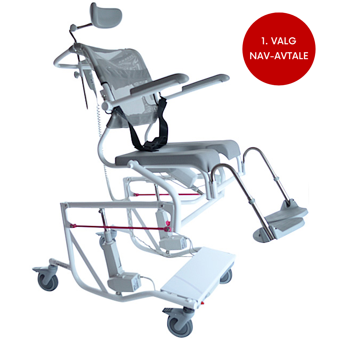 Elektrisk dusj- og toalettstol med trinnløs tilt og høyderegulering. Gir optimal ergonomi, høy komfort og enkel rengjøring – ideell for både hjem og institusjon